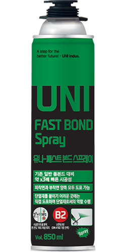 UNI-FAST BOND Spray 는 일액형 폴리우레탄 스프레이 타입의 본드로써 목재, 각종 보드 (PF,석고, XPS 등) 등을 붙일 때 편리하고 빠르게 시공할 수 있으며, 우수한 결로방지, 단열 성능을 가지는 제품입니다.